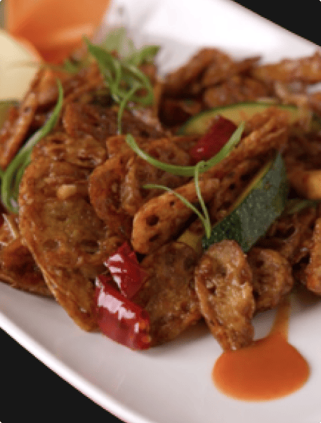 Crispy fried lotus stem tossed in spicy soy